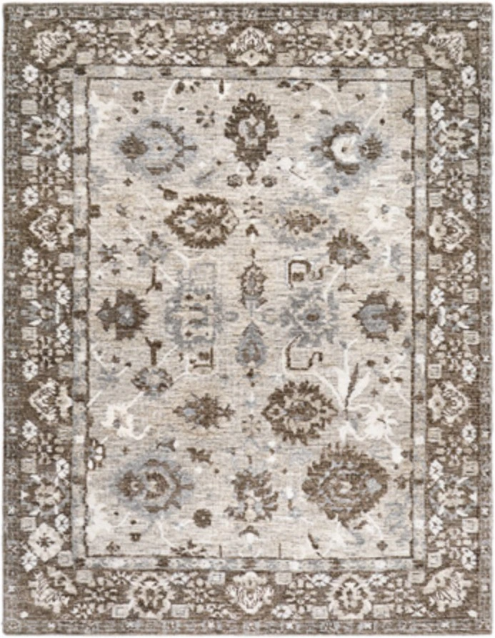 Machine woven, botanical design in brown, beige, gray and white