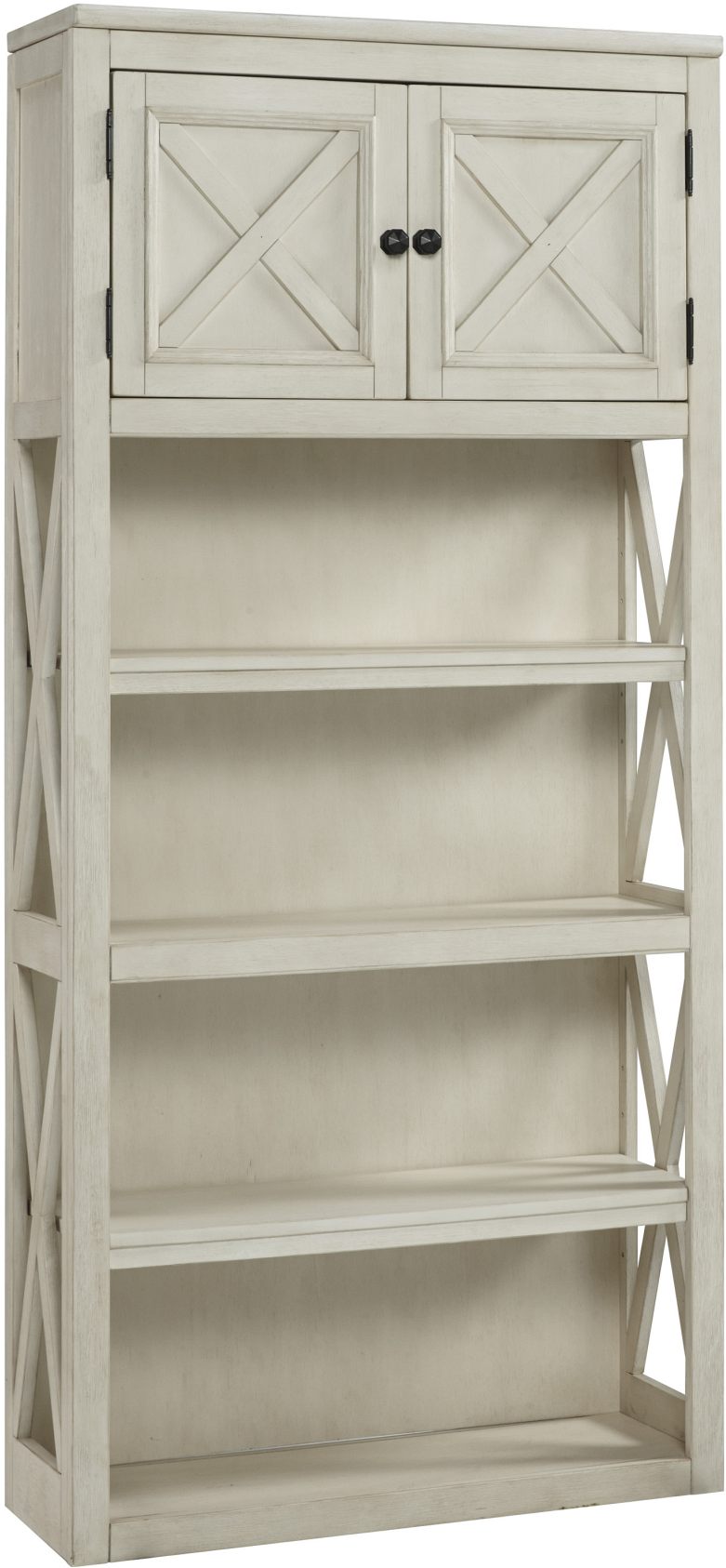 This Bolanburg bookcase features 4 spacious shelves and a top paneled cabinet that makes for space-efficient storage for your belongings.