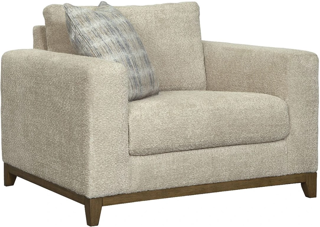 Serene style with a modern sensibility. Delight in the cozy, versatile embrace of this oversized chair. It takes an on-trend approach to irresistible texture and natural beauty, showcasing soft upholstery accented with a transitional wood trim.Read More